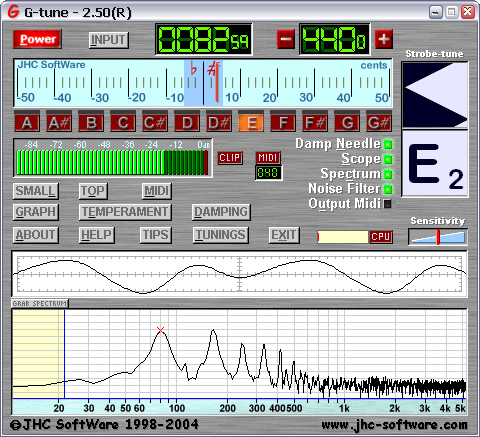 To see G-tune in action, look at the above picture. As you can see there is an oscilloscope display and a spectrum (frequency) analyser. A responsive needle lets you instantly see how in-tune your instrument is, and the LEDs indicate which note has been detected. There is also an advanced noise filter which allows you to tune your instrument in noisy environments (useful if there is lots of 50/60Hz hum).