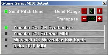 A logical extension of the pitch graph, allows G-tune to output MIDI notes. These notes can be sent to a synthesizer for play-back. This allows, for example, a guitar to be used as a MIDI controller, sending MIDI data to a synthesizer in real-time. G-tune is capable of measuring every nuance of a performance including pitch bend and vibrato. This can also be sent as MIDI if required by enabling the “Send Pitch Bend” button. Notes can be transposed, and the bend range adjusted to match your synthesiser or sound module.