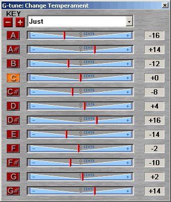 G-tune allows the selection of several common, and many lesser known temperaments. In addition, a “user” setting is available where the you can set any temperament you desire.