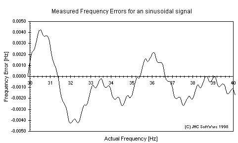 Thus it is clear that for a sinusoidal signal, the frequency measurement error is less than 0.01 Hz for all frequencies from 30 Hz to 5500 Hz. This error is very small indeed and it is likely that measurement errors introduced by the sound card will dominate the measurement process. Note that the maximum frequency G-tune can accurately measure will depend on the sound card used, but generally frequencies up to 5000 Hz are accurate.
